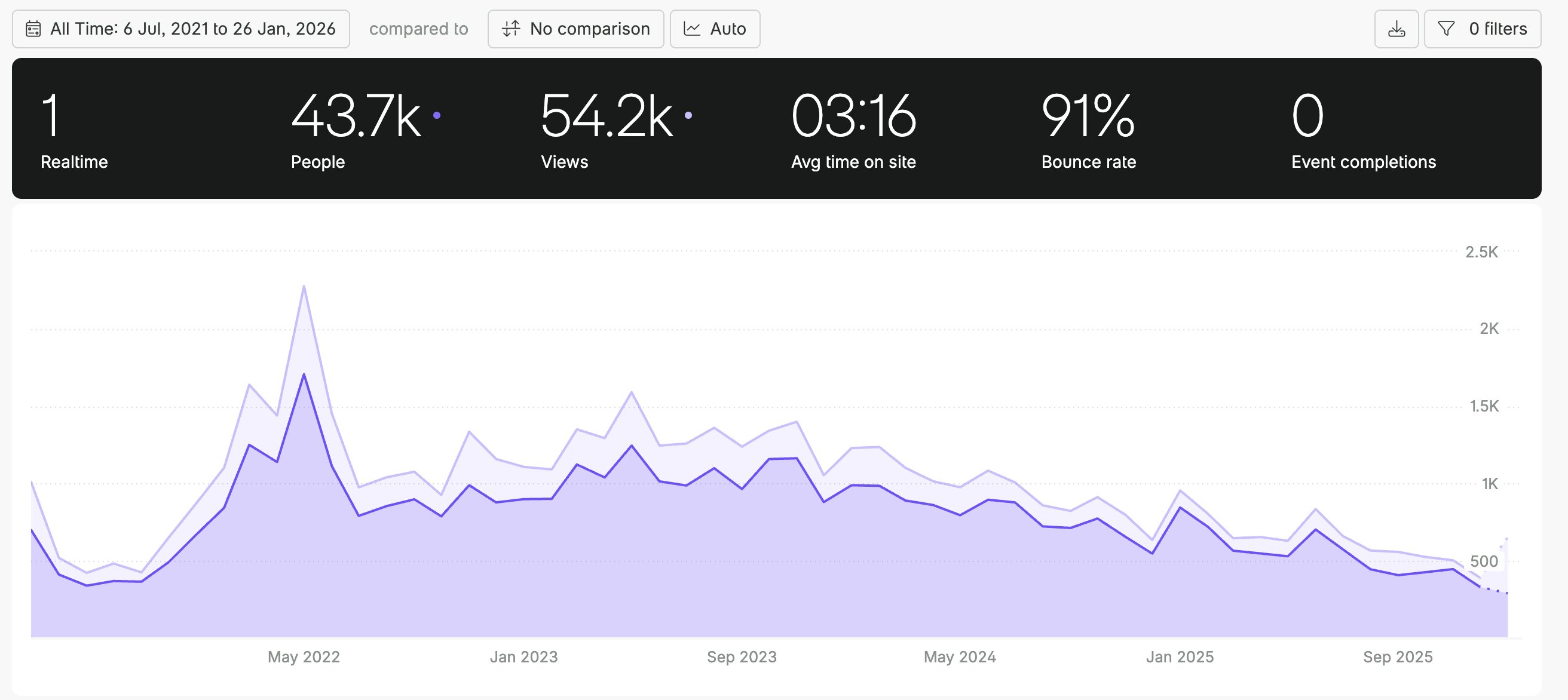 Before I cancelled my Fathom Analytics subscription, I took a look around the various dashboards and data views provided by the platform to have one last analysis of what the collected data says about traffic hitting my blog. I first added web analytics back on July 6, 2021, and it has been accumulating data ever since.