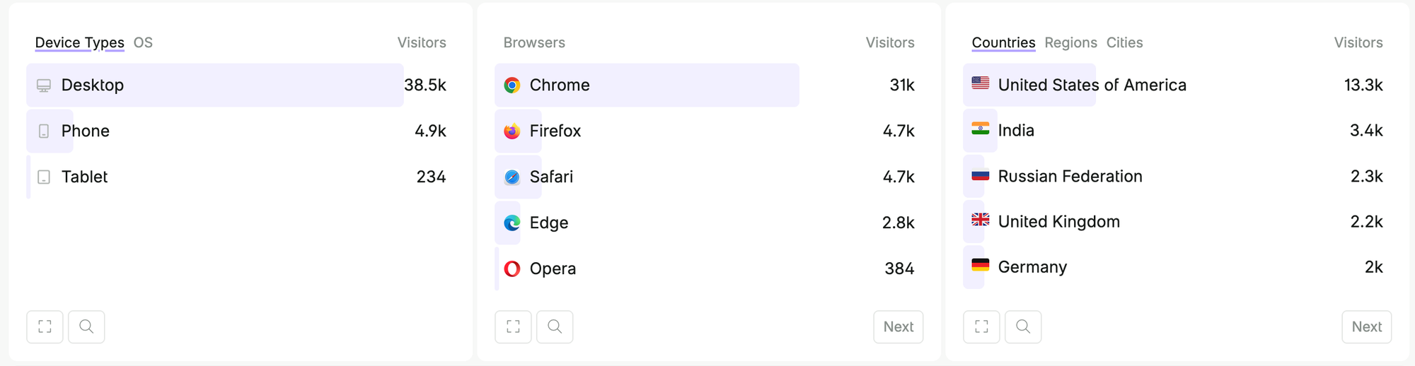 Next, we get a nice breakdown of page views grouped by device types, browsers, operating systems, and origin countries. It shows a somewhat varied distribution among various choices, and certainly tracks with general trends on what software or devices people tend to use. No big surprises here, well, apart from the seven people who visited the blog using Internet Explorer, to whom I would like to pose a question: why, seriously, why?